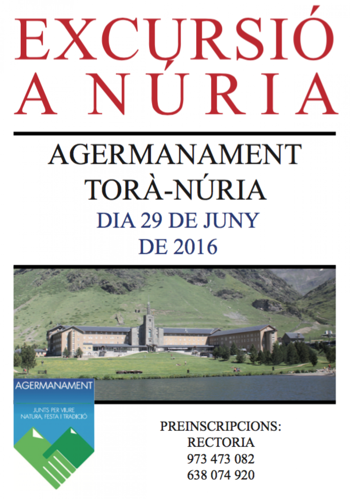 El proper 29 de juny, festa de sant Pere, es realitzarà una Excursió a Núria amb motiu de l'agermanament Torà-Núria