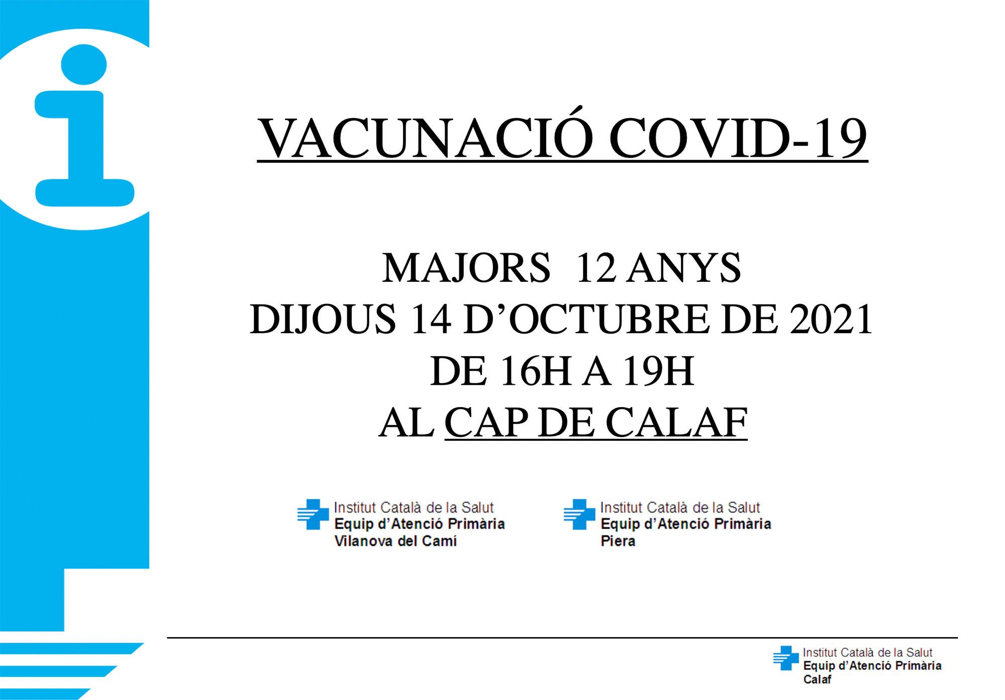 Dijous 14 d'octubre, de les 16 a 19h, al CAP de Calaf vacunaran de Covid-19 a tota la població major de 12 anys que encara no ho hagi fet i vulgui fer-ho. No cal cita prèvia.