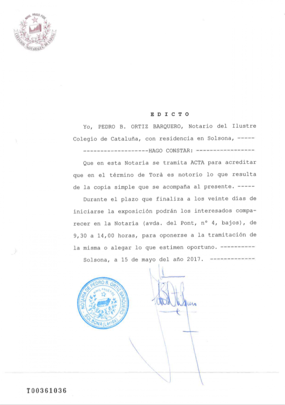 La còpia simple a que fa referència l'edicte, es pot consultar, dins dels terminis establerts, a l'Ajuntament de Torà